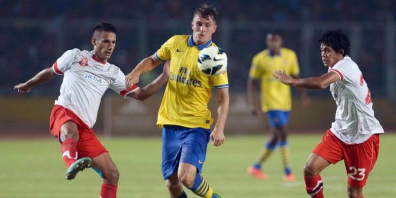 Pemain Arsenal Aaron Ramsey (tengah) dikepung dua pemain Indonesia, Raphael Maitimo (kiri) dan Rizky Pellu, dalam laga persahabatan di Stadion Utama Gelora Bung Karno, Jakarta, Minggu (14/7/2013. Indonesia dicukur habis oleh Arsenal 0-7.